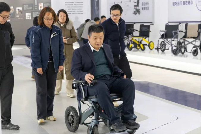 调研团首先参观了上海互邦的产品展厅。国铁领导们特别关注了互邦为公共交通场景专门设计的电动轮椅产品,这些轮椅采用轻量化材料,折叠后体积小巧,能够轻松通过标准通道,体现了互邦在无障碍出行领域的技术积累。